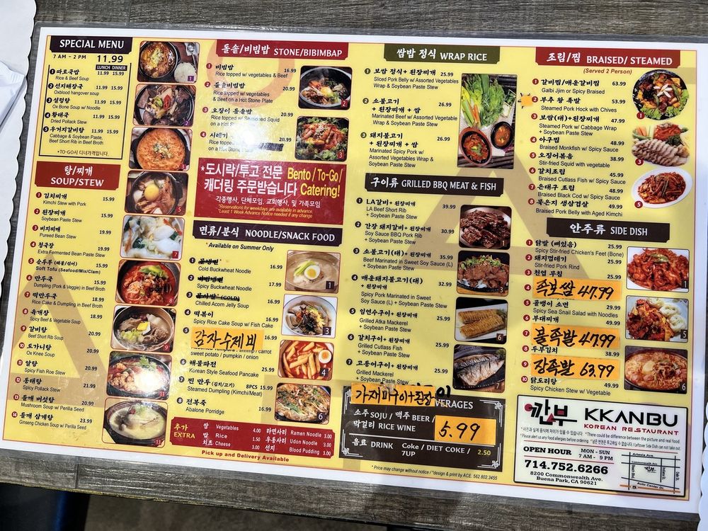Welcome to Kkanbu Restaurant, a hidden gem nestled in Buena Park offering authentic Korean homemade and soul food. Open early at 7 AM, Kkanbu is the perfect spot for a hearty breakfast, featuring enticing soup specials priced at just $11.99. The menu boasts a delightful variety of traditional dishes, from flavorful rice and beef stew to comforting dried pollack soup.